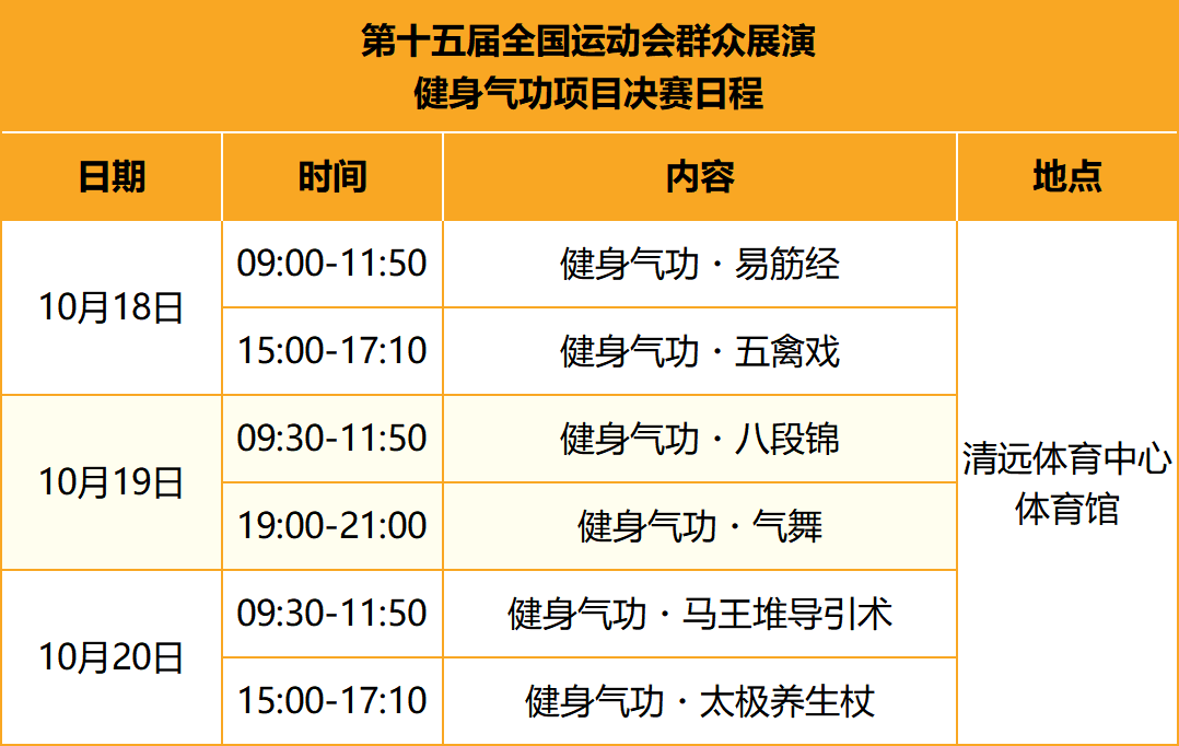 第十五届全国运动会群众展演健身气功项目决赛即将于10月18日至10月20日(周六至周一)在清远体育中心体育馆开赛。